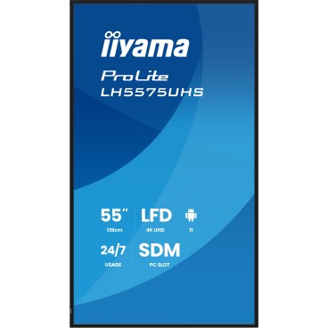 iiyama LH5575UHS-B2AG. Conception du produit: Écran plat de signalisation numérique. Taille de l'écran: 138,7 cm (54.6"), Technologie d'affichage: LCD, Résolution de l'écran: 3840 x 2160 pixels, Luminosité de l'écran: 500 cd/m², Type HD: 4K Ultra HD. Wifi. horaires de service (heures/jours): 24/7. Système d'exploitation installé: Android 11. Couleur du produit: Noir