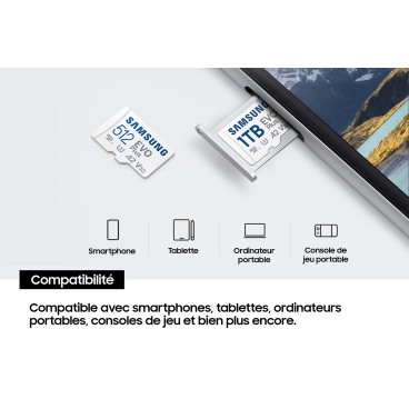 Samsung Carte MicroSD EVO Plus (2024) 1 To. Capacité: 1 To, Type de Carte Flash: MicroSD, Type de mémoire interne: UHS-I, Vitesse de lecture: 160 Mo/s, Vitesse d'écriture: 160 Mo/s, Classe de vitesse UHS: Class 3 (U3), Classe de vitesse vidéo: V30. Couleur du produit: Bleu, Blanc