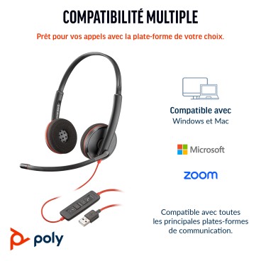 HP Poly Micro-casque Poly Blackwire 3220 stéréo USB-C + adaptateur USB-C/A. Type de produit: Casque. Technologie de connectivité: Avec fil. Utilisation recommandée: Business/Everyday. Poids: 119 g. Couleur du produit: Noir