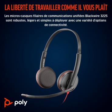 HP Poly Micro-casque Poly Blackwire 3225 stéréo USB-C + connexion 3,5 mm + adaptateur USB-C/A, Avec fil, Bureau/Centre d'appels, 200 - 6800 Hz, 119 g, Casque, Noir