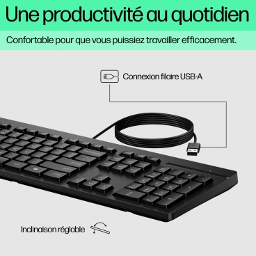 HP KBD 125 WD. Facteur de forme du clavier: Taille réelle (100 %), Technologie de connectivité: Avec fil, Interface de l'appareil: USB, Interrupteur à clé de clavier: Clavier à membrane. Couleur du produit: Noir