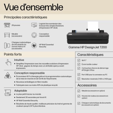 Concentrez-vous sur le projet, pas sur votre traceur. Cette imprimante offre une facilité d’utilisation incroyable avec les solutions d’impression HP par clic. [2] Elle est conçue de manière responsable pour vous aider à économiser de l’énergie[4] et à réduire votre utilisation de plastique[7]. De plus, elle est compacte et adaptable pour s’adapter à votre façon de travailler.