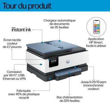 Cette imprimante est compatible HP+. Choisissez HP+ lors de la configuration du produit et profitez de nombreux avantages. HP+ nécessite un compte HP, une connexion Internet active et l’utilisation exclusive de cartouches d’encre HP authentiques tout au long de la vie de l’imprimante. Informations supplémentaires: http://www.hp.com/plus