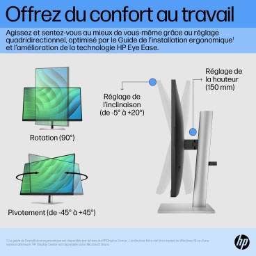 Éliminez les barrières entre vous et l’image. L’écran FHD E27 G5 HP offre une qualité d’image et une flexibilité hors pair, ainsi qu’un confort ultra-personnalisable. Aussi élégant qu’écoresponsable, cet écran est votre compagnon parfait pour le bureau et la maison.