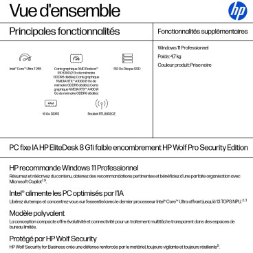 HP EliteDesk 8 SFF G1i AI Wolf Pro Security Edition. Famille de processeur: Intel Core Ultra 7, Modèle de processeur: 265. Mémoire interne: 16 Go, Type de mémoire interne: DDR5-SDRAM, Fréquence de la mémoire: 5600 MHz. Capacité totale de stockage: 512 Go, Supports de stockage: SSD. Modèle d'adaptateur graphique inclus: Intel Graphics. Wifi. Système d'exploitation installé: Windows 11 Pro. Alimentation d'énergie: 280 W. Type de châssis: SFF. Type de produit: PC. Poids: 4,7 kg. Couleur du produit: Noir