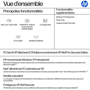HP EliteDesk 8 SFF G1i AI Wolf Pro Security Edition. Famille de processeur: Intel Core Ultra 9, Modèle de processeur: 285. Mémoire interne: 32 Go, Type de mémoire interne: DDR5-SDRAM. Capacité totale de stockage: 1 To, Supports de stockage: SSD. Modèle d'adaptateur graphique inclus: Intel Graphics, Modèle d'adaptateur graphique distinct: NVIDIA RTX A400. Wifi. Système d'exploitation installé: Windows 11 Pro. Alimentation d'énergie: 280 W. Type de châssis: SFF. Type de produit: PC. Poids: 4,7 kg. Couleur du produit: Noir