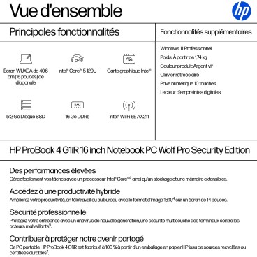 HP ProBook 4 G1iR Wolf Pro Security Edition, Intel Core 5, 40,6 cm (16"), 1920 x 1200 pixels, 16 Go, 512 Go, Windows 11 Pro