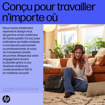 Nous avons entièrement revisité notre conception et les matériaux haut de gamme. Cette sacoche au style fonctionnel s’agrandit en fonction de vos besoins professionnels ou personnels. De nombreuses poches vous permettent de ranger tous vos appareils. Conservez vos effets personnels à proximité tout en protégeant la planète grâce au matériau externe entièrement fabriqué à partir de plastiques recyclés[1].