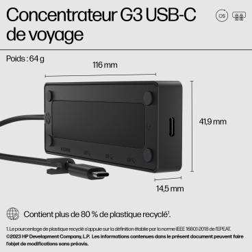 HP Concentrateur USB-C de voyage G3. Technologie de connectivité: Station d'accueil, Interface de l'hôte: USB 3.2 Gen 1 (3.1 Gen 1) Type-C. Couleur du produit: Noir, Pays d'origine: Viêt Nam, Segment HP: Professionnel. Type de source d'alimentation: USB. Largeur: 116 mm, Profondeur: 41,9 mm, Hauteur: 14,5 mm. Largeur du colis: 173 mm, Profondeur du colis: 59 mm, Hauteur du colis: 39 mm