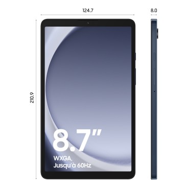 Samsung Galaxy Tab A9 SM-X110N. Taille de l'écran: 22,1 cm (8.7"), Résolution de l'écran: 1340 x 800 pixels, Technologie d'affichage: LCD. Capacité de stockage interne: 128 Go. Fréquence du processeur: 2,2 GHz, Famille de processeur: Mediatek. Mémoire interne: 8 Go. Résolution de la caméra arrière (numerique): 8 MP, Type de caméra arrière: Caméra unique, Résolution de la caméra avant (numerique): 2 MP, Caméra avant. Norme Wi-Fi: Wi-Fi 5 (802.11ac). Lecteur de cartes mémoires intégré. Poids: 332 g. Couleur du produit: Marine