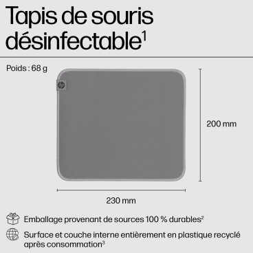 HP Tapis de souris désinfectable 105. Largeur: 230 mm, Profondeur: 200 mm. Couleur du produit: Gris, Coloration de surface: Monochromatique, Matériel: Polyester, Caoutchouc